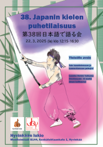 38. Japanin kielen puhetilaisuus järjestetään sunnuntaina 22.3.2025 (la) klo 12:15-16:30 paikan päällä Hyvinkään lukiossa. Yleisölle avoin. Tule kuuntelemaan ja kannustamaan puhujia!